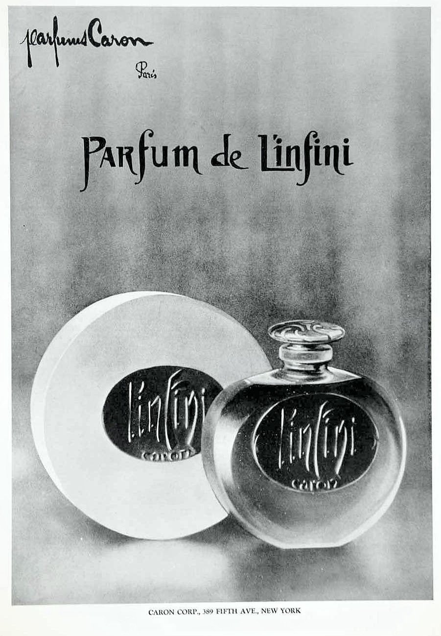 I am a sucker for what I call the old-school civet-laden aldehydes, and my vintage Caron Infini parfum is one of the greats in this genre, with a superb floral heart and a lingering base that includes the sort of fine sandalwood that seems past recapturing. So far, Infini can be had for less than an arm and a leg on ebay. If you are an aldehyde fan, I recommend it. Both the mini I acquired and the 1 oz were sealed and in great condition at a price short of thee digits (: