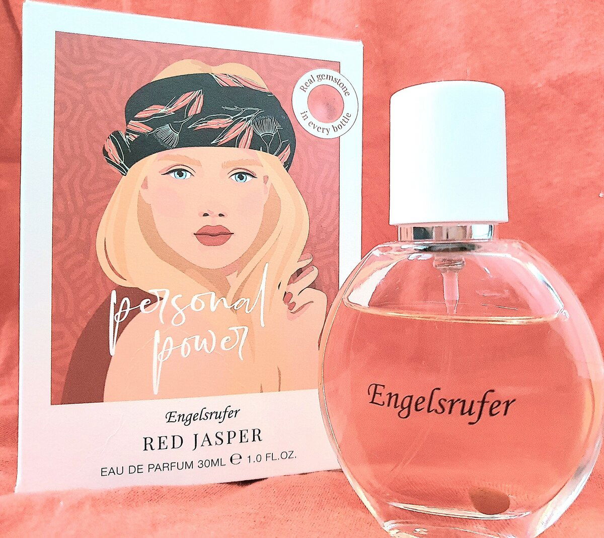 The bottle contains a gemstone (red jasper).