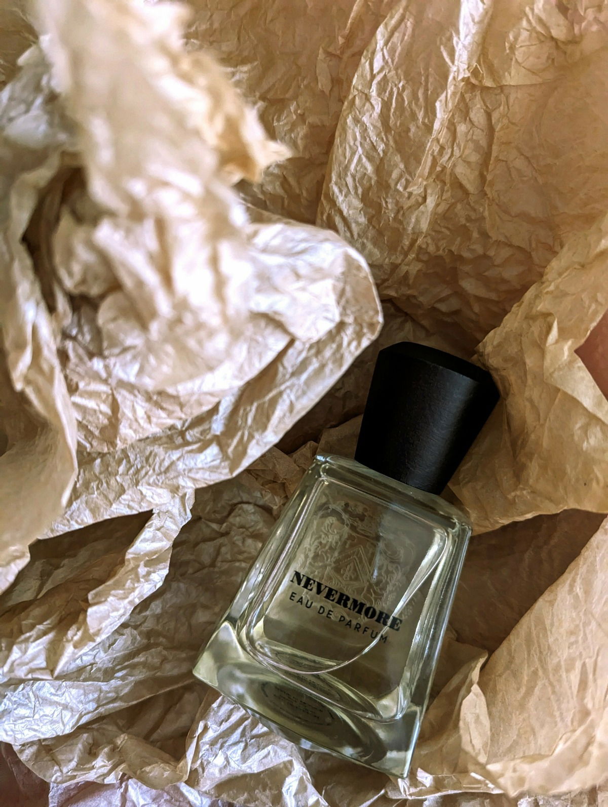 Back to the question. If I knew nothing of three roses, the cold January morning, the cognac and the poem, then I would have thought the smell of "Nevermore" is one of a dark salon and heavy brocade, aged roses and black frock coats. That alcohol plays a certain role can also be suspected. Poe himself tolerated alcohol so poorly, that he probably would have been struck heavily just by a perfume smell.