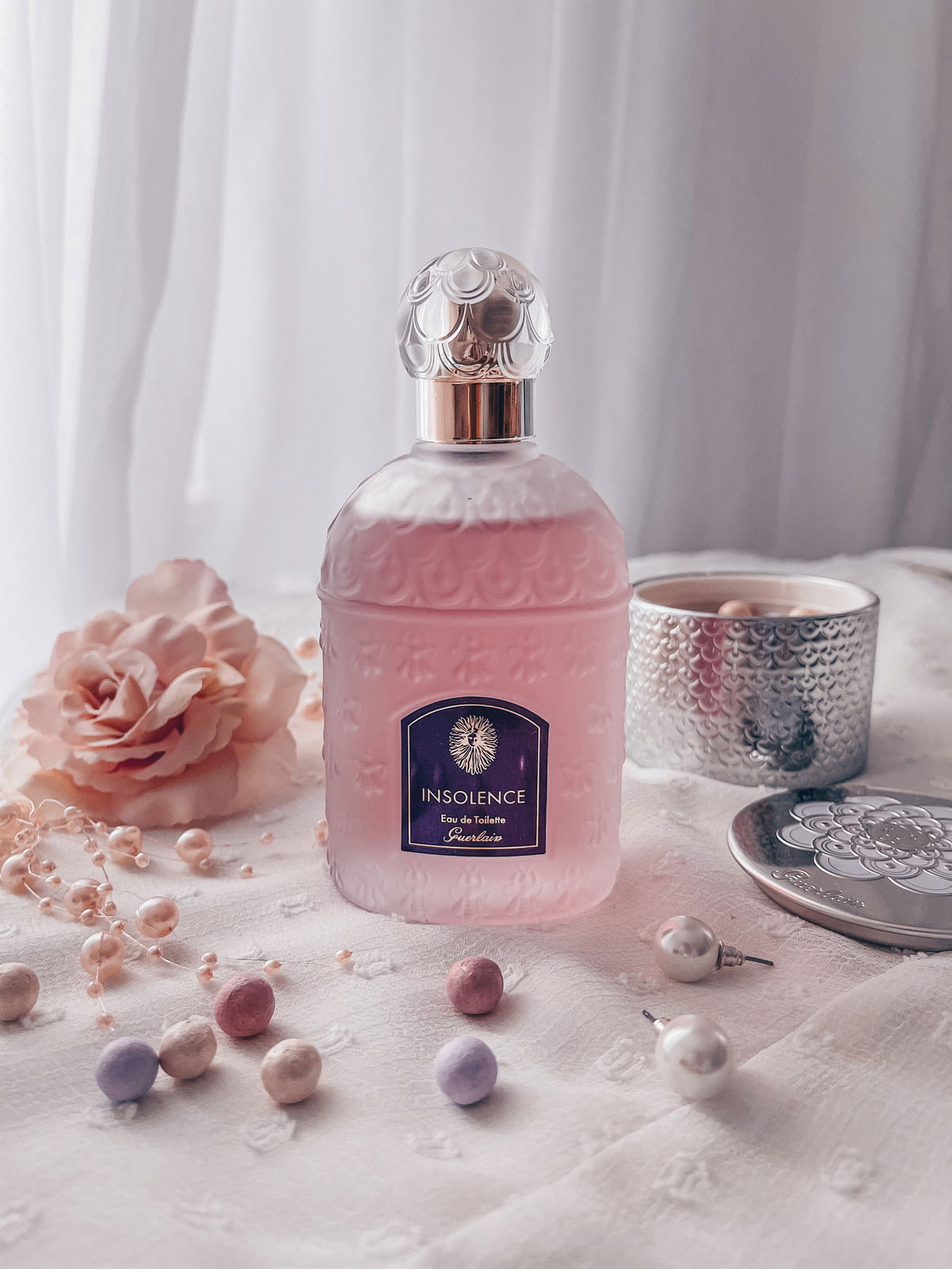 The base is a lovely, rather dusky blend of tonka and sandalwood, and once the top notes calm, Insolence is not overly sweet. After a short time, the tonka helps to move the perfume to the sweetened side, which is a combination of candied and floral sweetness. The addition of a sandalwood note helps to bring the sweetness down to earth while creating a wrap of warmth around the florals. The more the scent approaches the end, the more it settles with a lightly sweet powdered vanilla violet resting on a subtle base of sandalwood. And then there is a whisper of resins, perhaps the same used in Shalimar as I catch the same vibe. Towards the end, the fragrance becomes warmer due to the resin and wood notes. But a hint of violets remains until the very end - very delicate and gracefully sweet.