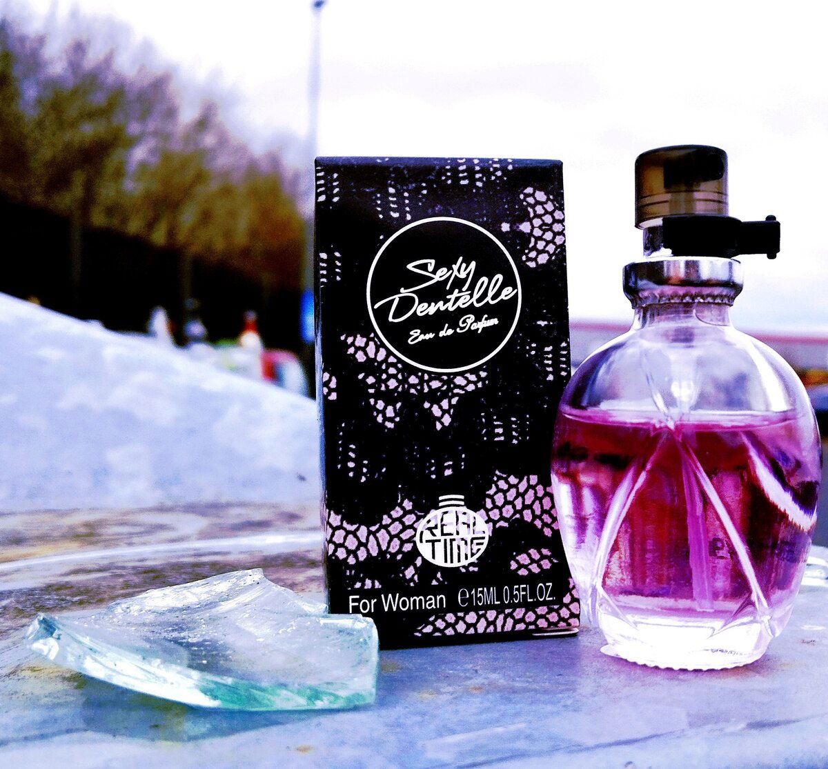 Secondly, the bottle. Cheaply processed plastic attached to the glass bottle. Overlaid with cheap, chemically stinking lace.