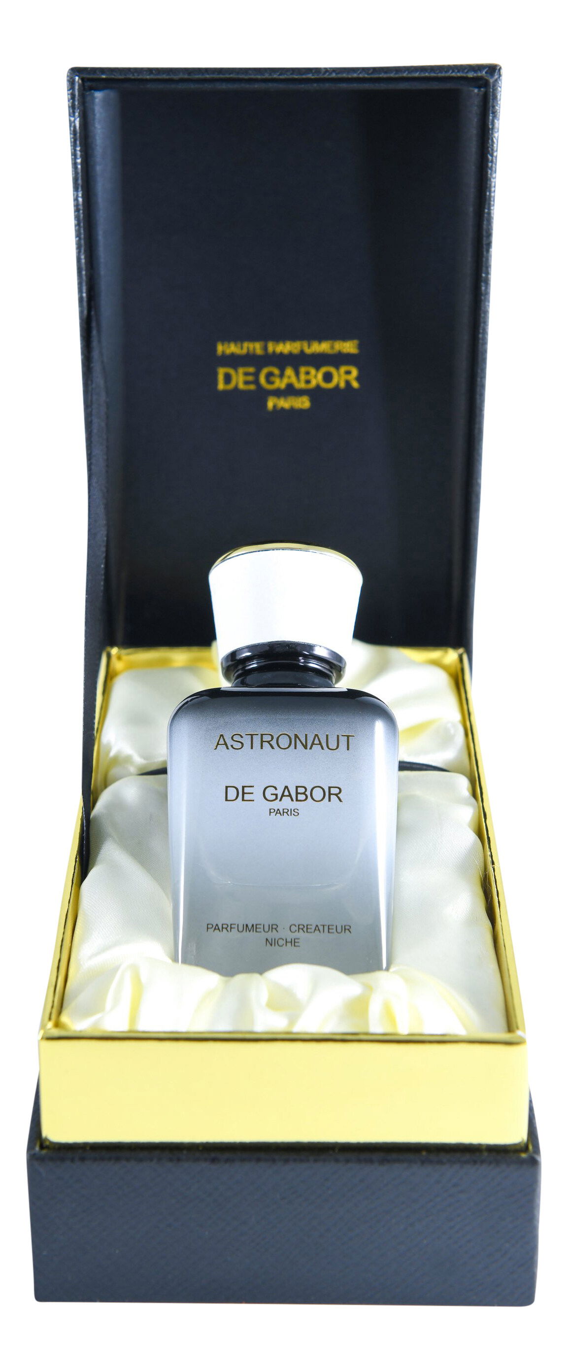 The bottle is softly nestled in a black-gold, quite large box, impressive and dignified. Very solid soft glass with a gradient from clear to silver-white to black, topped with an equally solid white-gold cap. Clear golden lettering on it, and the whole thing has a face, a very valuable one at that. I like it.