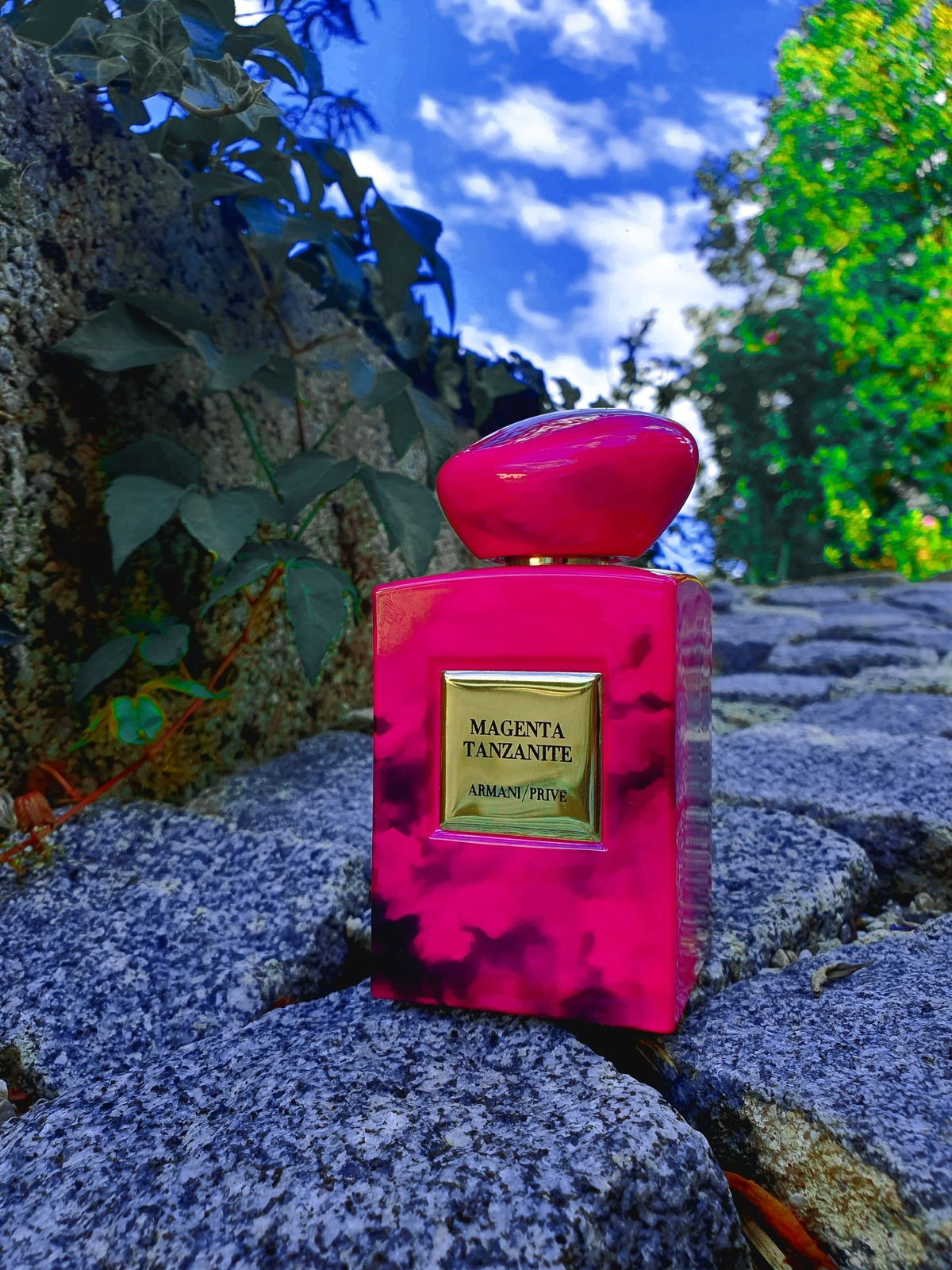 Magenta steht vor Dornröschens Schlossmauer...wenn keiner guckt, klettert sie an der Ranke über die Mauer...die Spiegelung im Flakon ist fantastisch...wieder ein Traumbild von dir...🥰🙋♀️💙💜