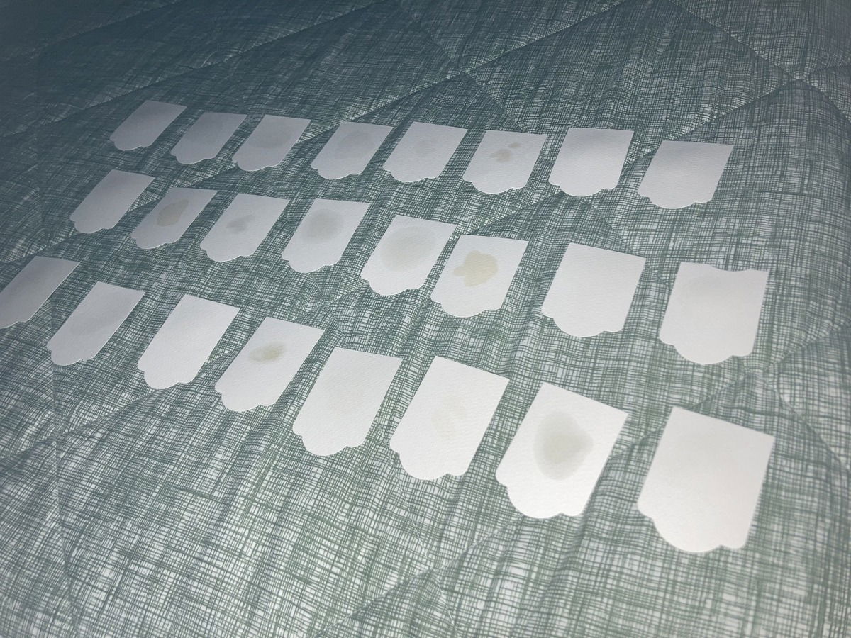 Cards are turned with the label side facing down and arranged in lines. This is done in a dimly lit environment to avoid judgment or attempt at identification based on the spray stain.