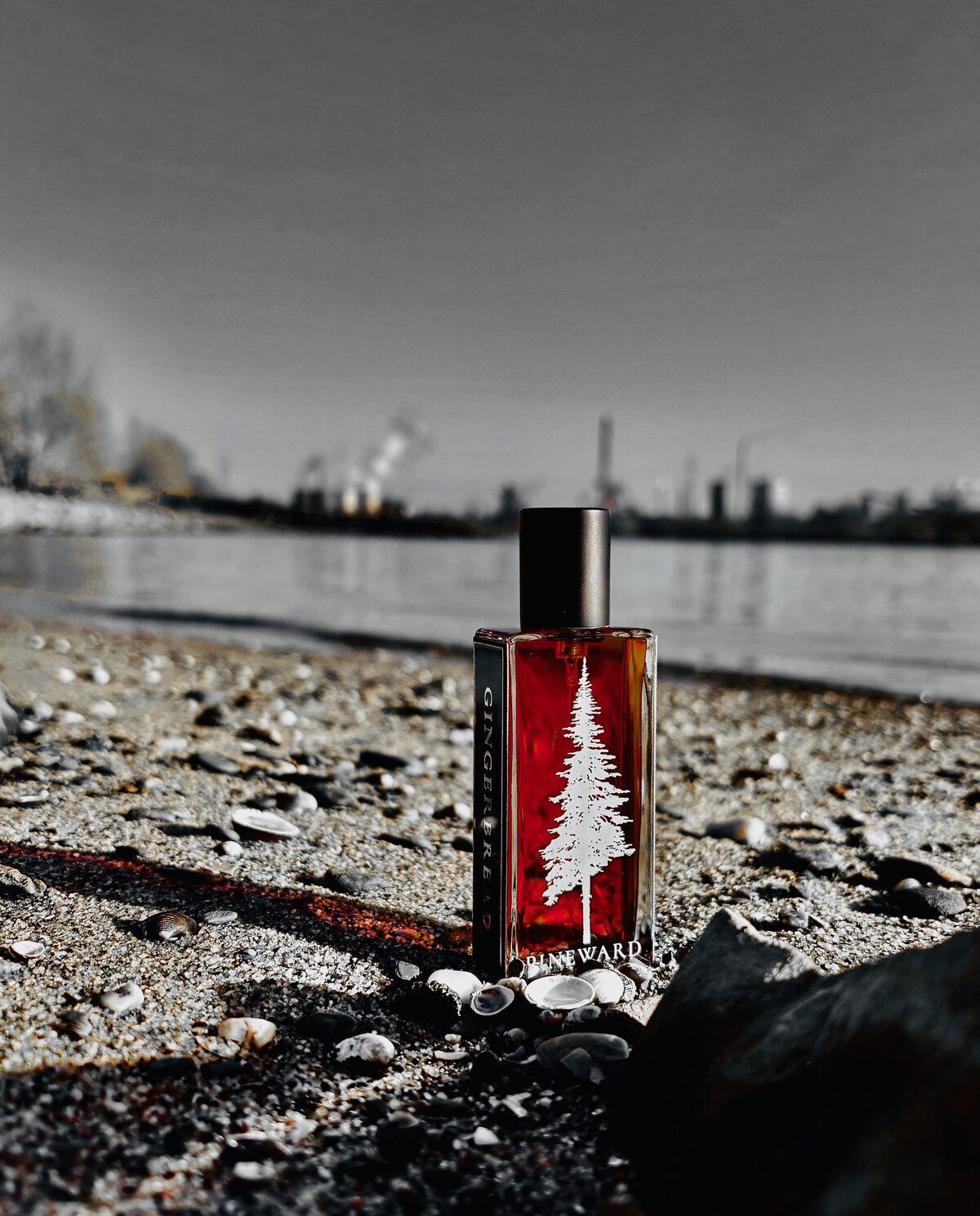 Auffallend gut ! Der Flakon im Kontrast zu dem Industriegelände und Fluss, Top !