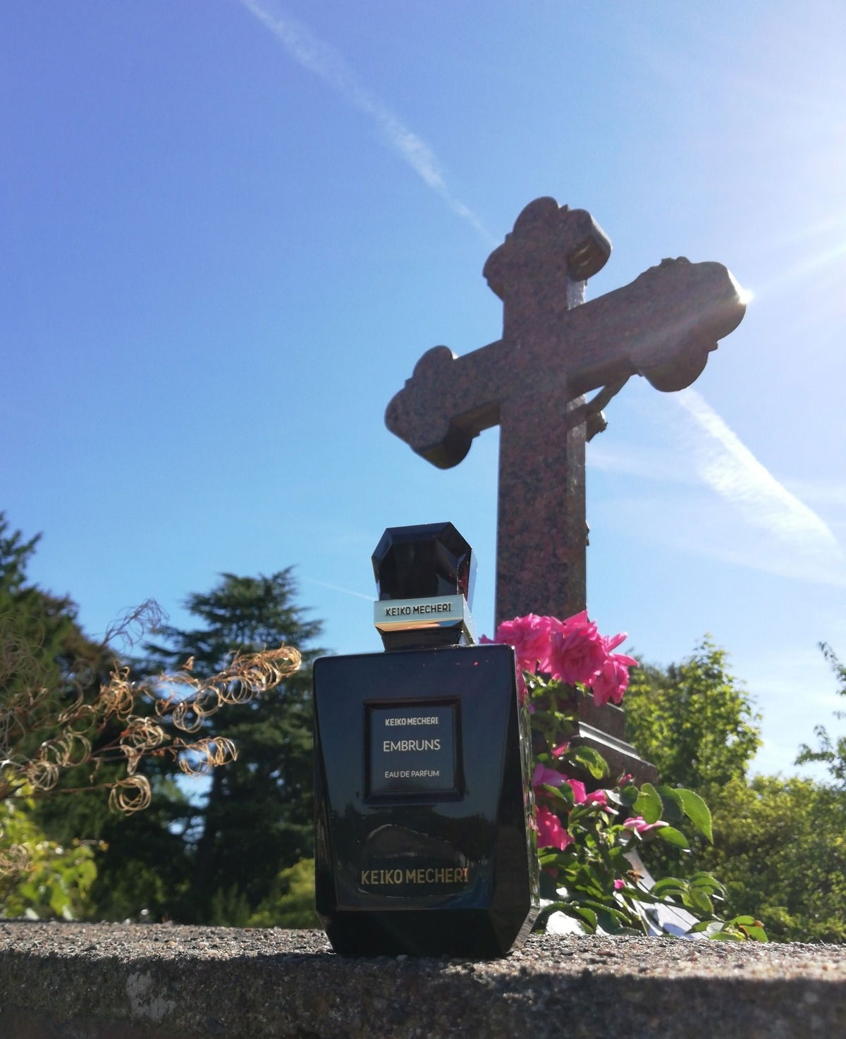 Die Aufnahme wirkt fröhlich durch den wolkenlosen Himmel. Der schwere Flakon und das beeindruckende Kreuz gefallen mir. Intensive Stimmung.