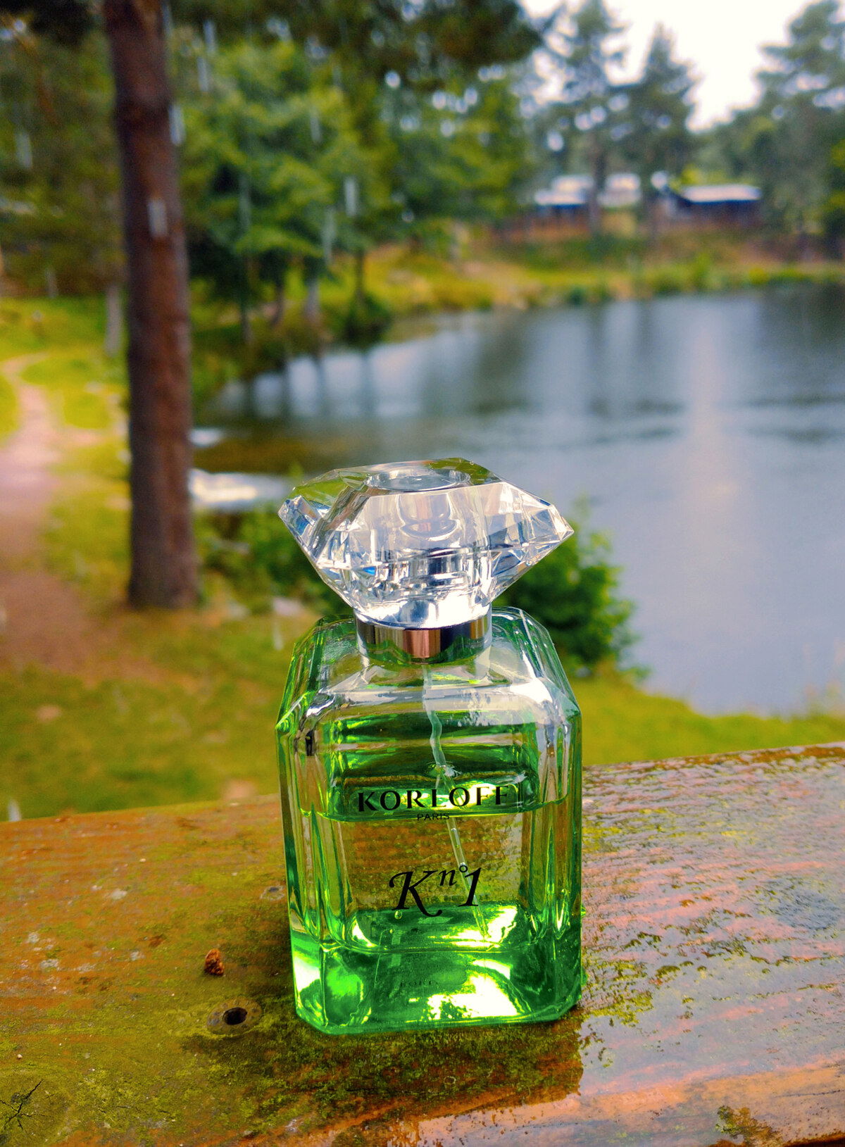Das passt perfekt! Dieser wunderschöne grüne Flakon inmitten der Natur!
