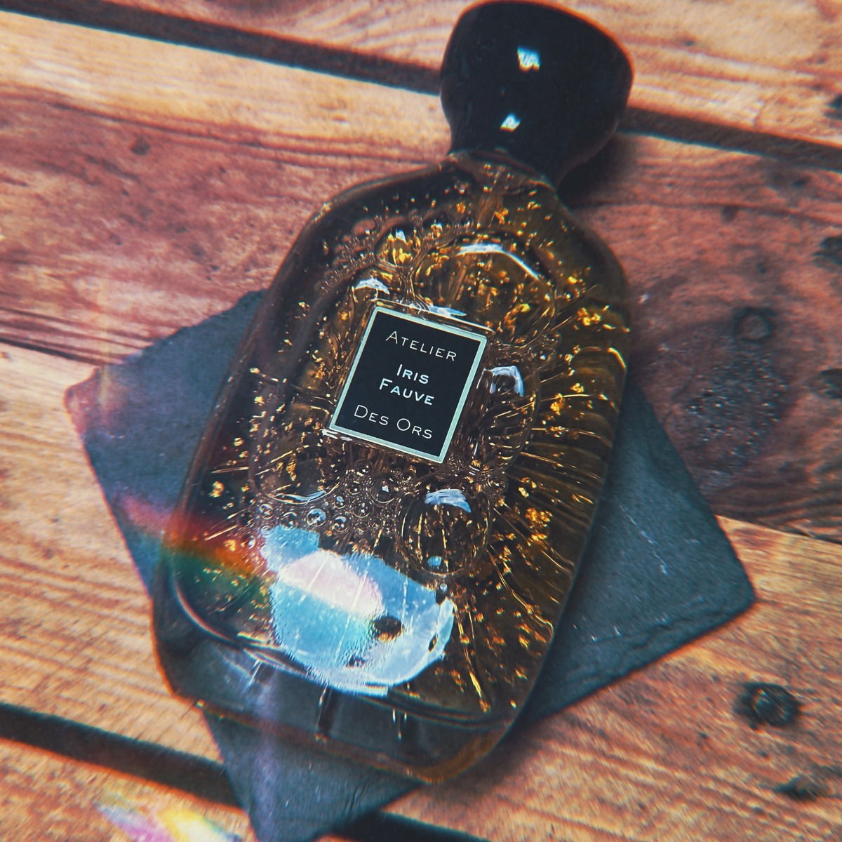 Der wunderschöne Flakon passt farblich sehr gut zu dem Holz.