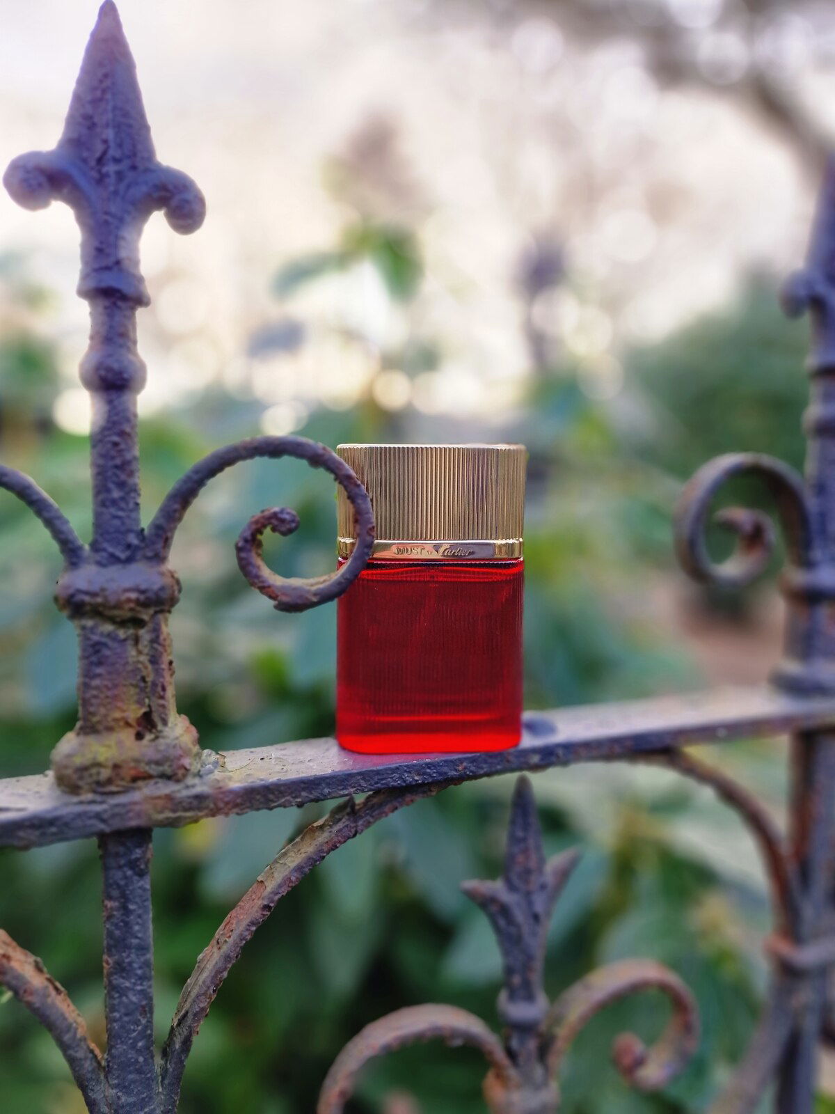 This beautiful and elegant bottle, with that intense red color, looks wonderful on that door whose ornaments point to the sky ❤️🥰