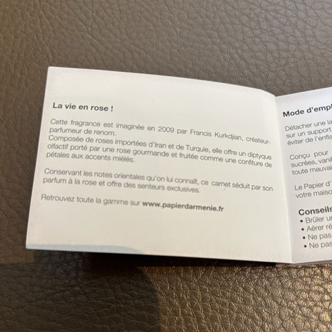 Today I got a booklet of Papier d´Armenie in Rose as a present. I have heard about this type of perfume product before but never got to actually see one until now, and was I surprised by it! First, because for being a thin and delicate paper sheet the fragrance is strong! I can only imagine what happens when you burn it. The second surprise was to find out that Francis Kurkdjian had composed this rose scent.